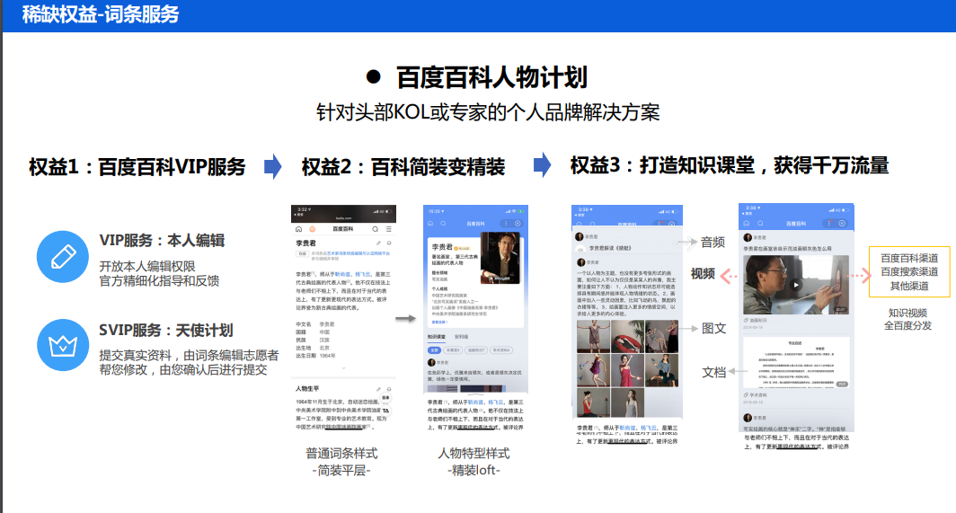 百度百科人物计划是针对头部KOL或专家的个人品牌解决方案;